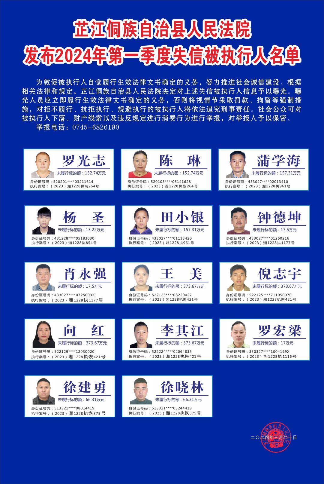 芷江融媒讯(通讯员 刘健 李颜馨 )为持续加强对失信被执行人的曝光和惩戒力度,年3月28日,芷江人民法院公布2024年首批失信被执行人名单,14名“老赖”被曝光。