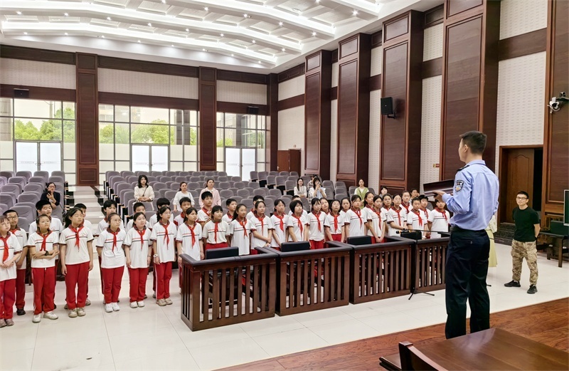 在法院干警引导下,同学们先后参观了审判庭、诉讼服务中心、法治文化阵地、警营文化和青少年法治教育实践基地等场所。为创新活动方式,女法官李敏为同学们上了一堂“保护妇女儿童权益,助力社会和谐稳定”的主题法治课,发放了涉妇女权益保障、未成年人保护和家庭教育等内容的宣传手册150余份。在青少年法治教育实践基地,同学们通过操作普法自助终端,便捷地获取到了自己想了解的法律常识,了解了我国古代历史上包拯、狄仁杰、海瑞等具有高尚品质和公正执法精神的清廉官员。