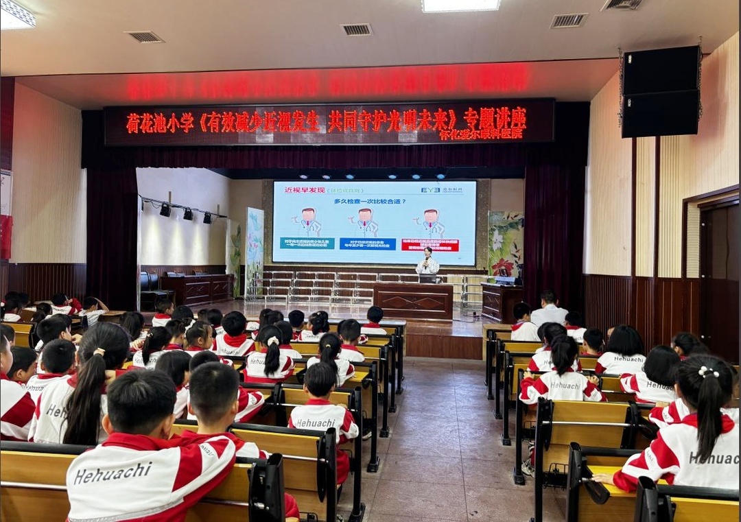 (5月24日,怀化爱尔眼科专家在荷花池小学开展“有效减少近视发生 共同守护光明未来”专题讲座)