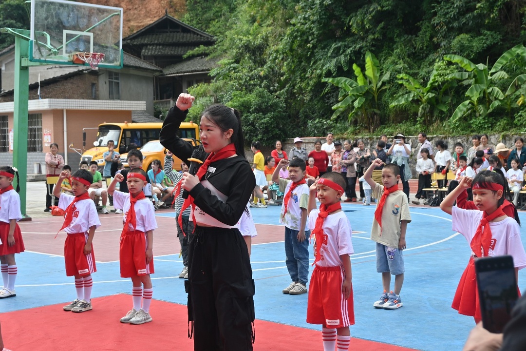 入队仪式之后,孩子们开始进行文艺汇演,小演员们与来自县文化馆的大演员,以合唱、舞蹈、朗诵等形式展示着各自的绝活,观众们个个兴高采烈,合着欢快的音乐,节拍声、歌声、掌声不断,阳光与笑脸相映,歌声与笑声齐飞。