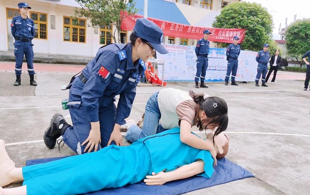 活动中,救援队讲解员详细地向学生们讲解当同学落水时怎样抛书包、递木棍、抛绳索和怎样穿救生衣等救援办法;向师生们演练了遇突发事件人员拥挤,被推倒在地如何保护自己的身体不受伤害、气道异物梗阻如何紧急处理等;同时还现场教授了心肺复苏的正确步骤。