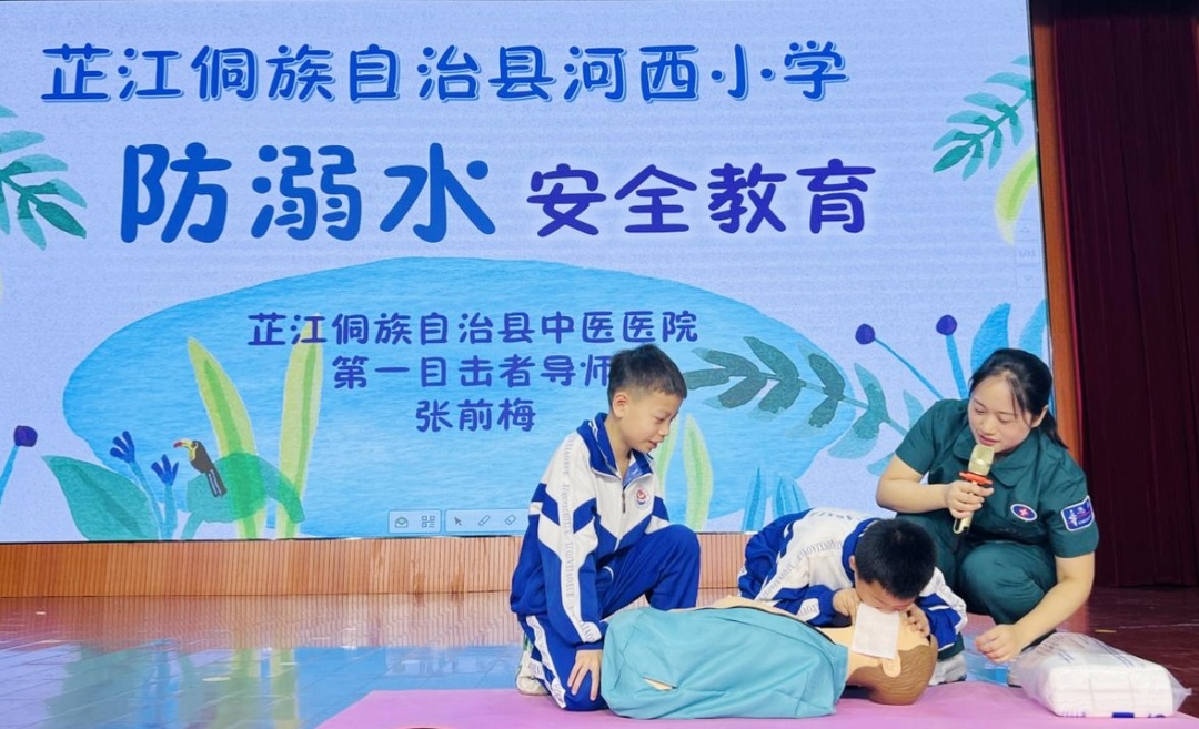 上午,来自芷江中医院的资深急诊急救专家张前梅为同学们带来了“防溺水安全教育”讲座,张医生用亲切的语言引导学生畅谈自己对防溺水的认识,再深入浅出地从预防溺水的措施、溺水时的自救方法、发现有人溺水时的救护方法、同伴溺水后如何急救等方面,用一个个鲜活的案例告知学生防溺水的重要性,并现场借助视频、肢体语言教同学们掌握一些简单的自救办法,学生们积极模拟场景演练。