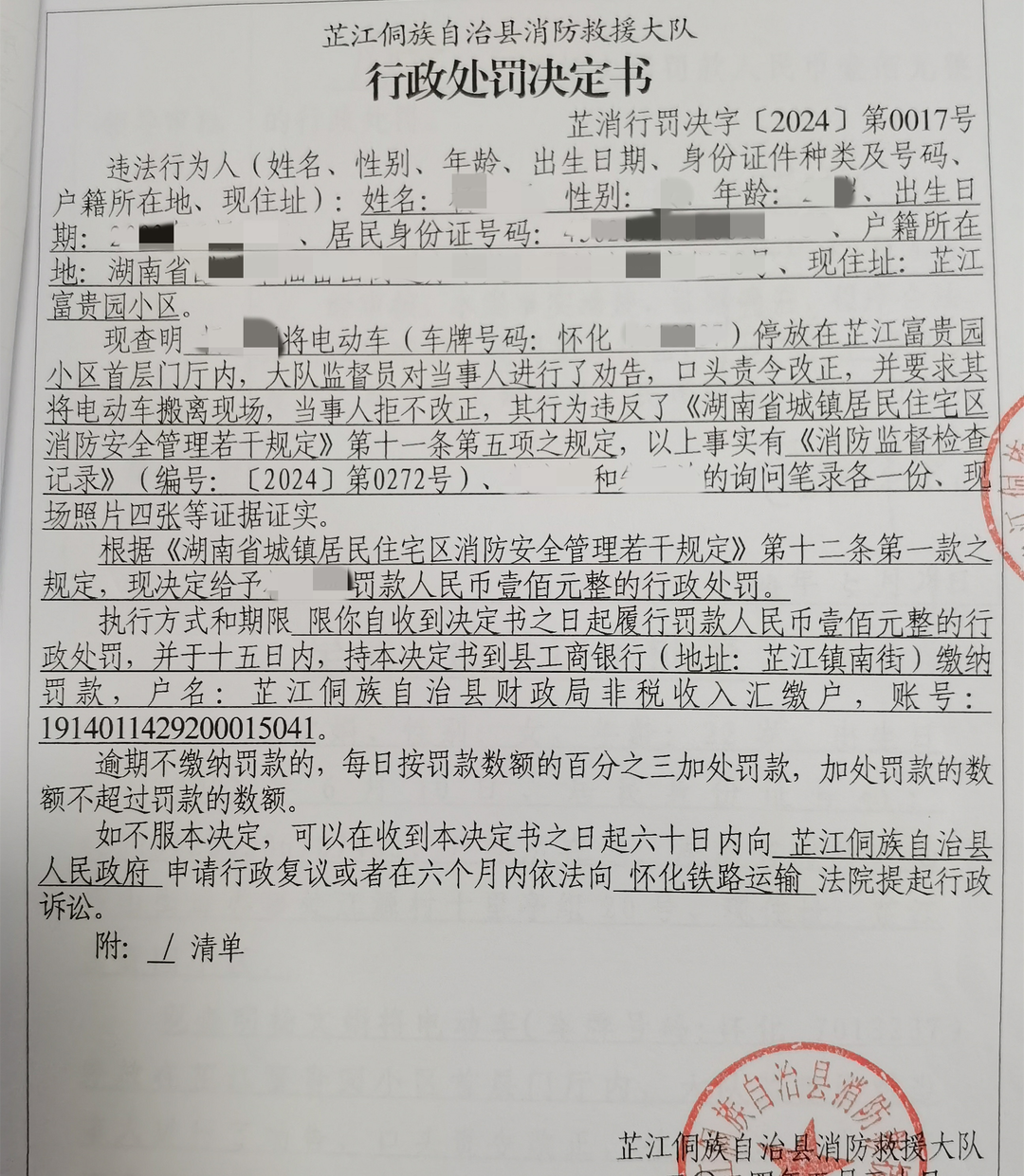 芷江融媒讯(通讯员 刘慧婷)近日,芷江消防救援大队依法对2名违规停放电动自行车并拒不改正的业主分别给予罚款人民币壹佰元的行政处罚。