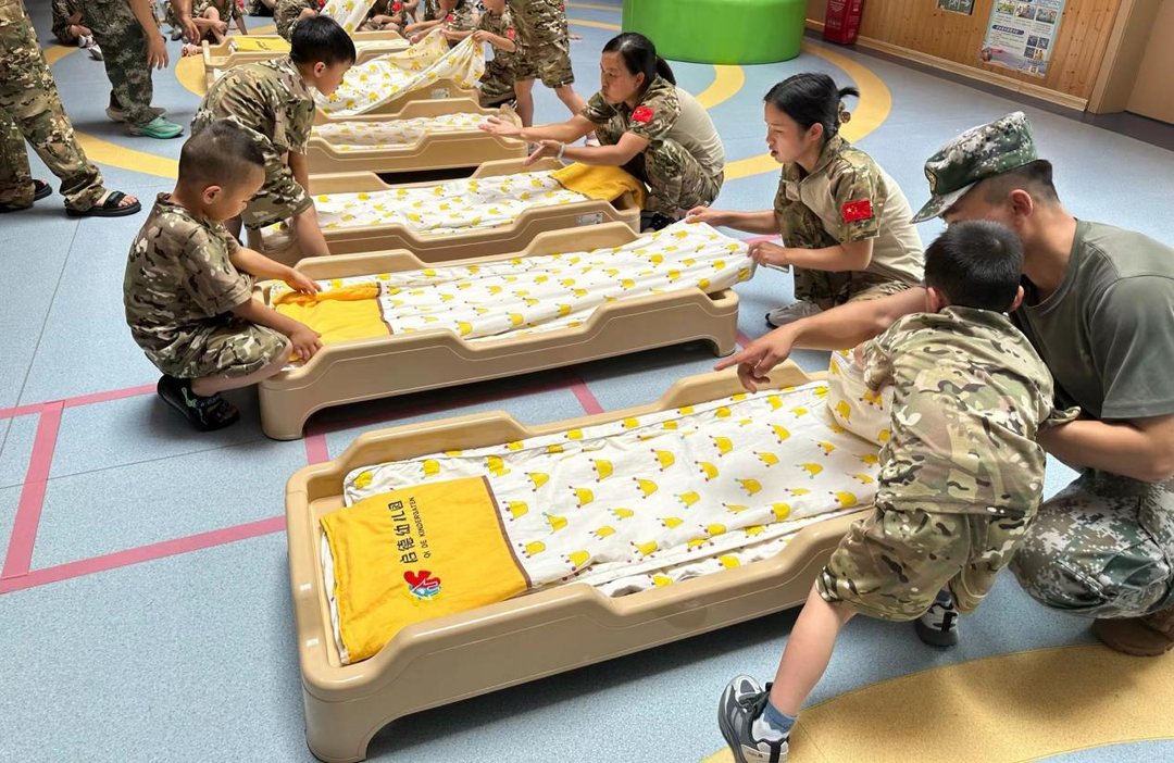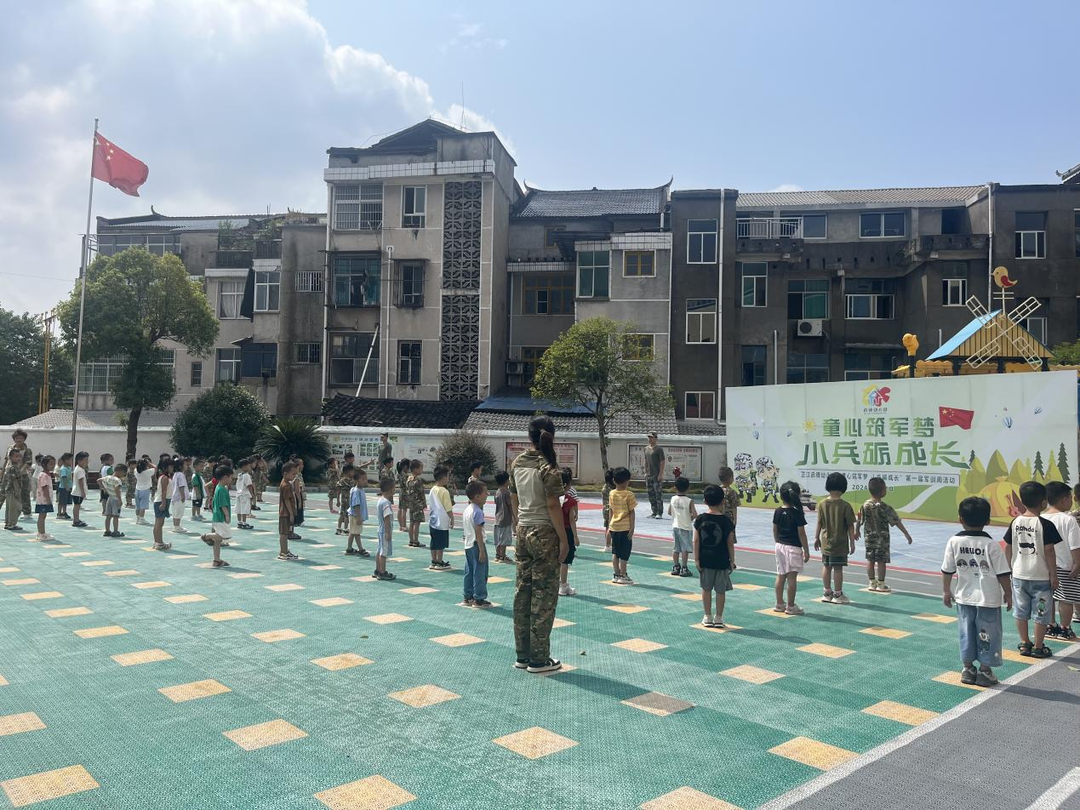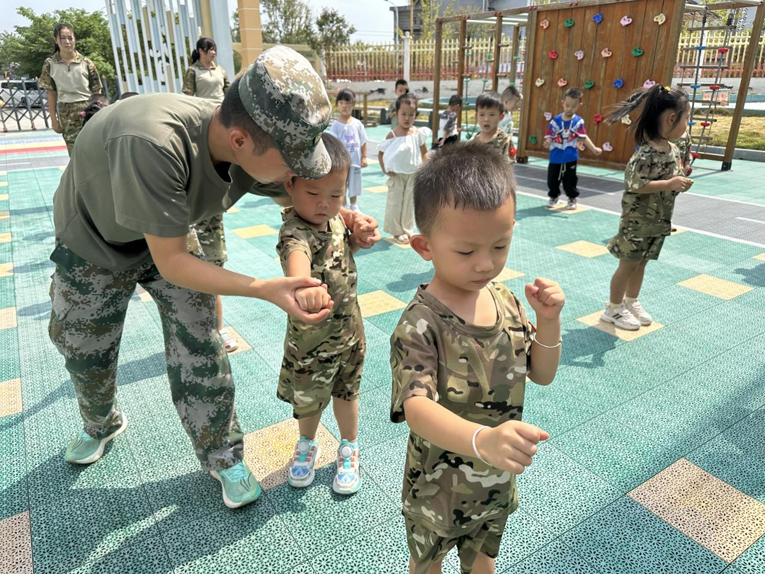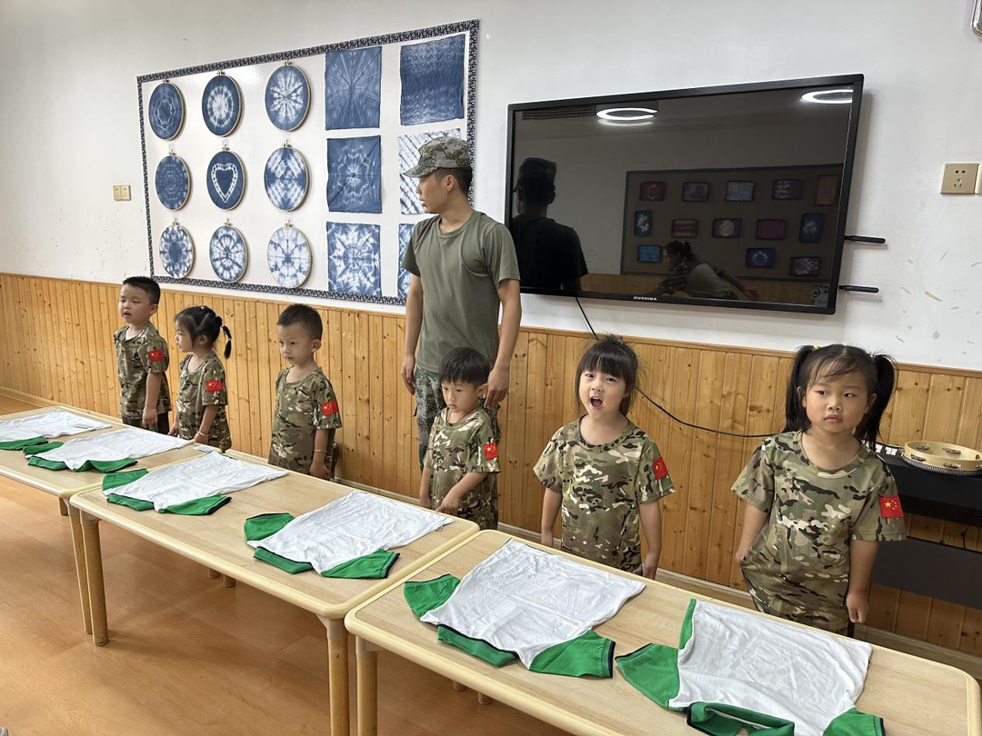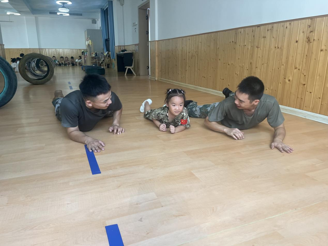 该园中大班的军训体验活动内容包括基础队列训练、基础拳术训练、匍匐前进、实践拉练、内务整理。活动中,孩子们既紧张又兴奋,随着教官“立正、稍息、向右转、向后转、……”的指令,军训活动一天天有序的进行着,孩子们也在一天天成长着。9月6日上午闭营仪式举行,孩子们精彩地展示了军训成果。