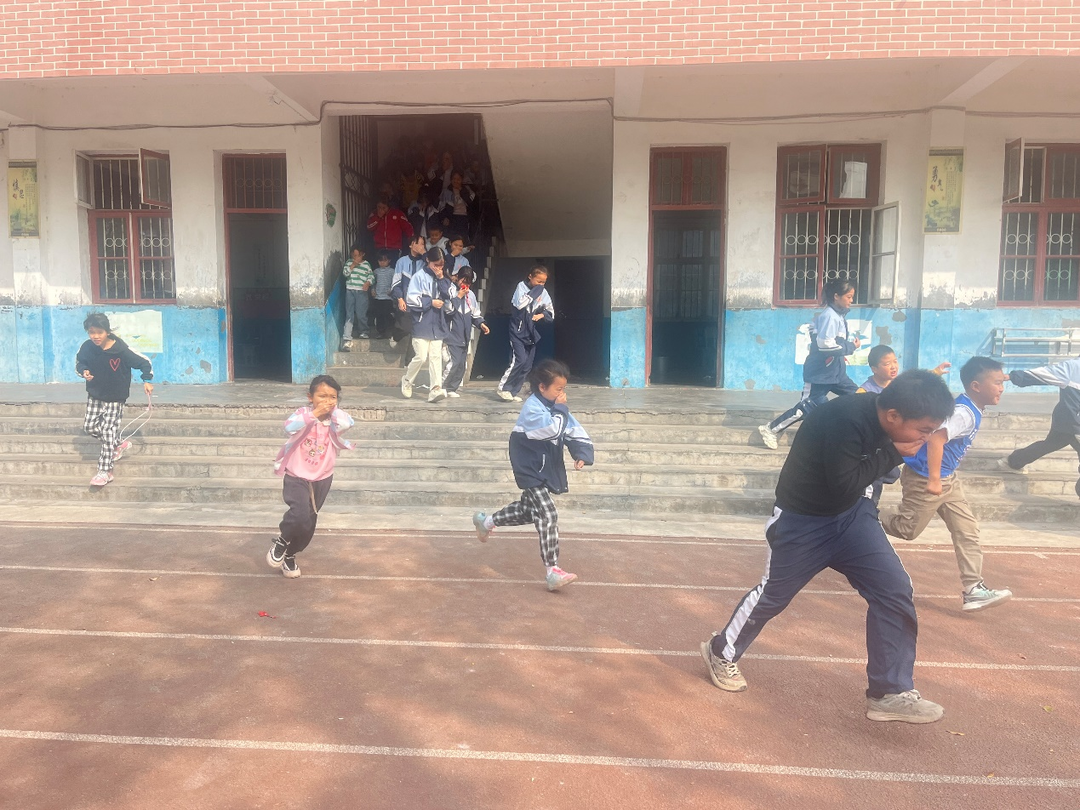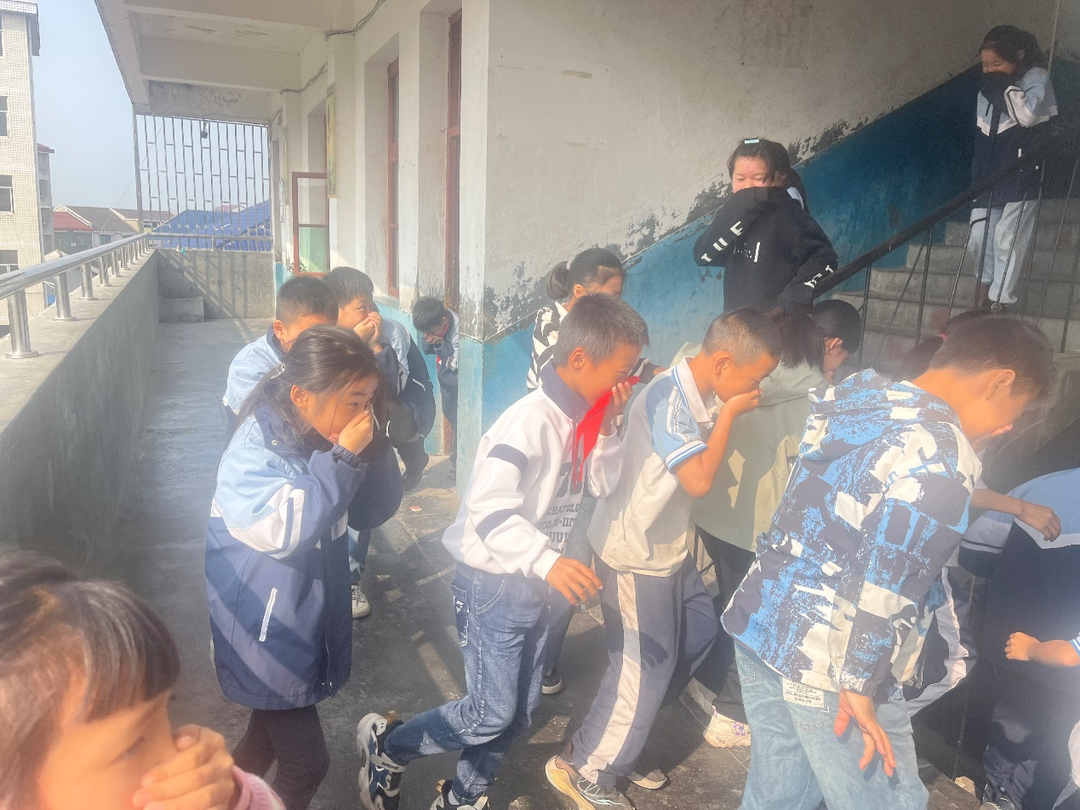 随着警报的拉响,全体师生迅速进入紧急状态。在班主任老师的指挥下,学生们用纸巾捂住口鼻,弯腰低姿快步前行,仅用了3分钟,全校17个班700余名学生从教学楼安全撤离到操场集合。