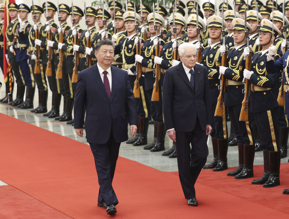天安门广场鸣放21响礼炮,礼兵列队致敬。两国元首登上检阅台,军乐团奏中意两国国歌。马塔雷拉在习近平陪同下检阅中国人民解放军仪仗队,并观看分列式。