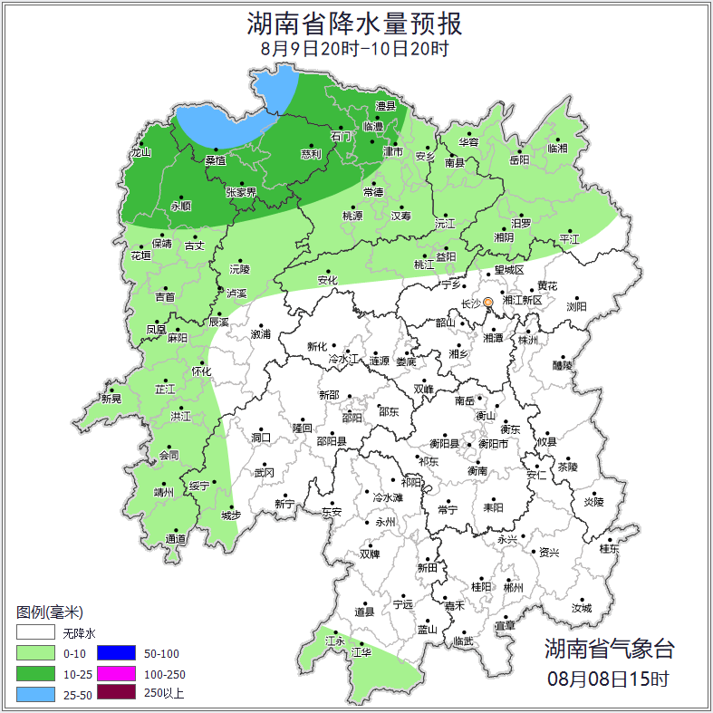 8月9日晚上至10日白天,湘北多云转小到中等阵雨或雷阵雨,其中张家界北部、常德北部局地大雨,其他地区晴天间多云,湘西、湘南局地有阵雨或雷阵雨;南风2~3级,雷雨时局地阵风7~8级;最高气温湘西北32~34℃,其他地区35~38℃,最低气温26~29℃。