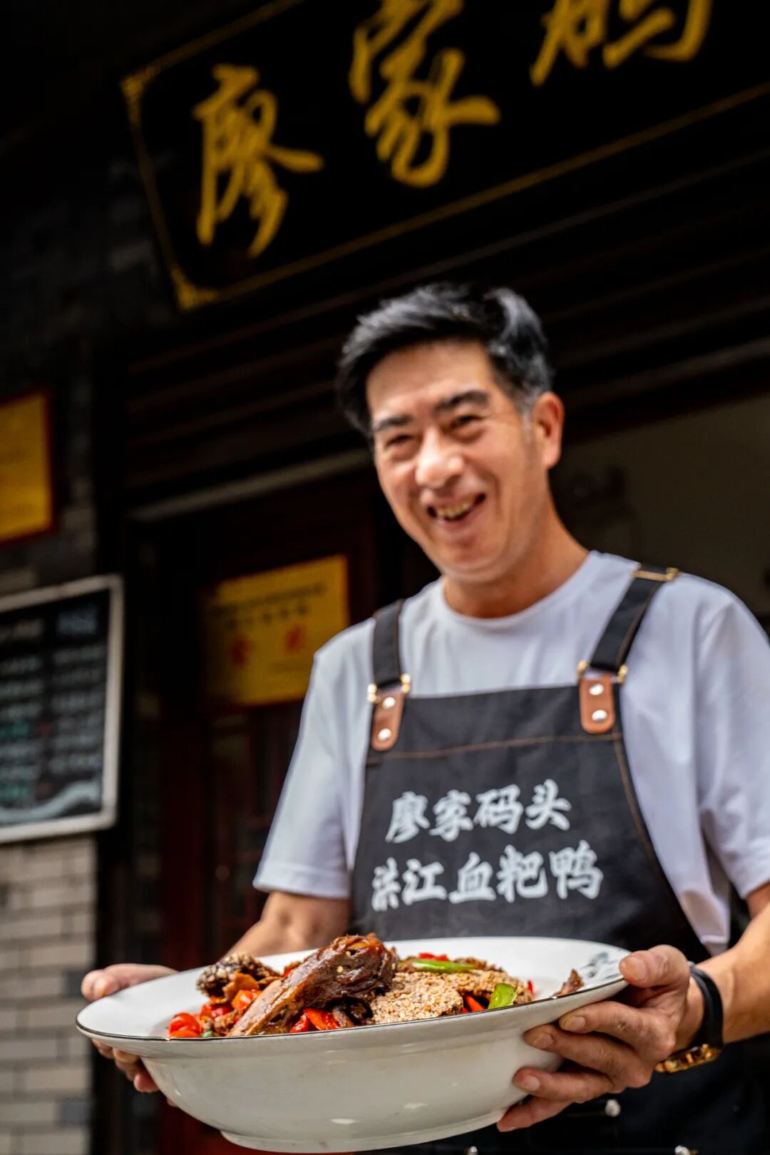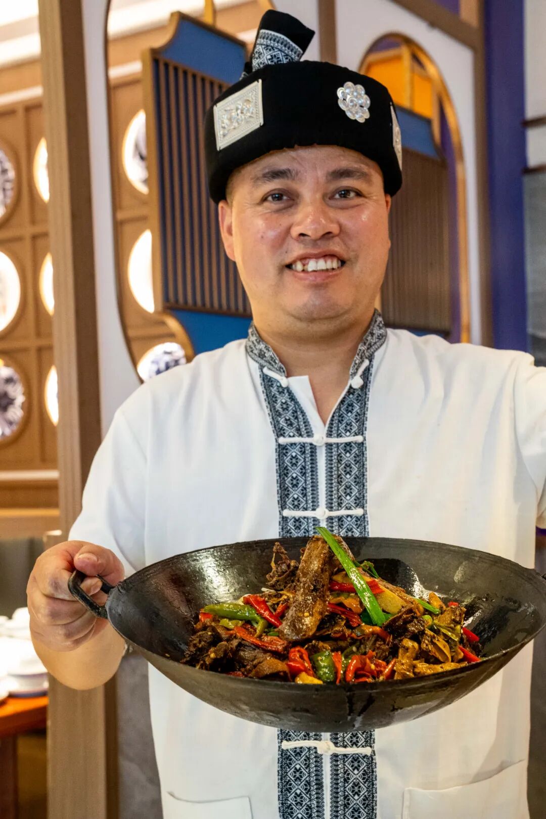 做鸭先做血粑,糯米泡两小时拌鸭血,蒸晒油炸后外脆里糯。炒鸭时先炸鸭头鸭掌,煸香鸭肉加洪江特有的甜酱,最后放血粑同焖,汤汁收浓,鸭鲜、粑糯、酱香混在一起。“甜酱是灵魂,我家的甜酱要日晒夜露720天,酱香味浓郁。”问秘诀,他笑说:“用心就好,做菜和做人一样,糊弄不得。”