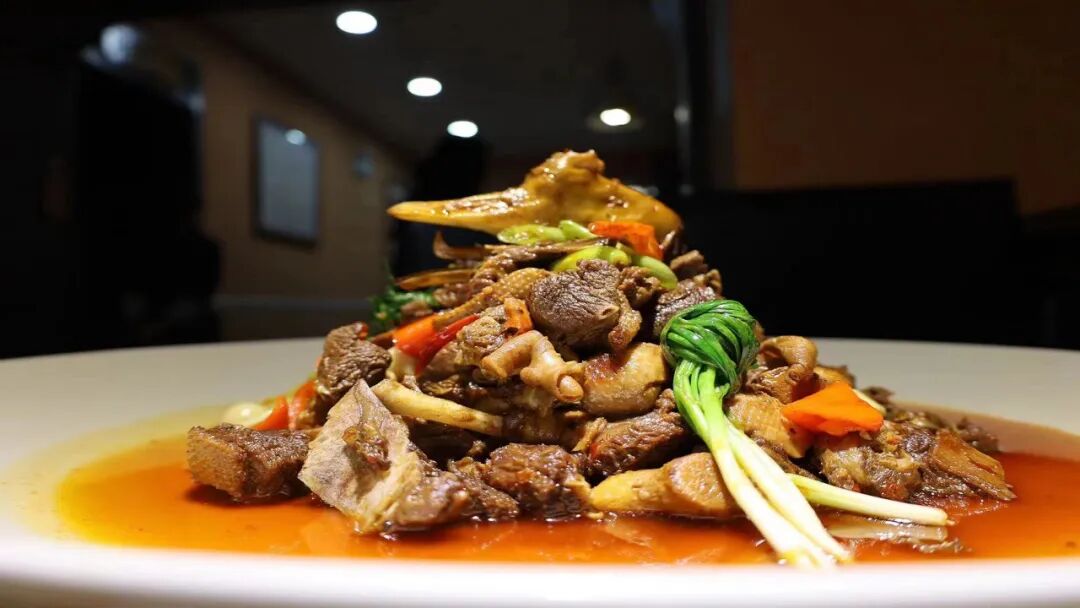 麻阳白鹅藏着苗乡三百年烟火。乾隆《辰州府志》记载的“打鹅会”至今上演,更有意思的是“定亲鹅”——苗族小伙提亲必挑壮鹅系红绸,女方收下即定终身。地道黄焖麻阳鹅,鹅肉煸金黄,高压锅焖出胶质,加米酒米醋“软化骨头”,拌秘制辣椒粉。夹一筷子辣得冒汗却停不下,麻阳人调侃:“这辣,是日子红火的味道!”