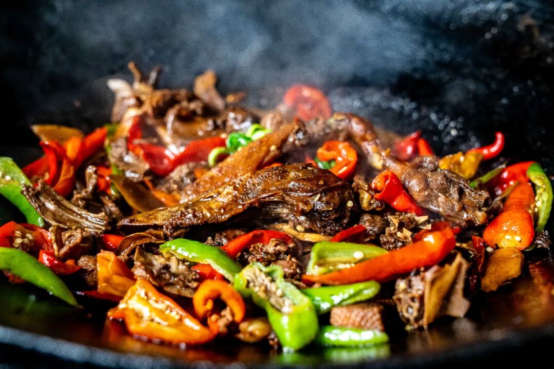铁锅烧冒烟,倒本地茶油,鸭块炒至金黄,加子姜、蒜瓣、青红辣椒“三炒三焖”——炒出鸭油,焖出胶质,再炒出香气。最后撒芷草,“侗乡秘密武器,去腥提鲜”。出锅时鸭肉红亮,辣椒翠绿,咸辣带微甜,肉质紧实不柴。杨才华说:“每天卖百多只,长沙人开车来吃,这是‘芷江味道名片’。”