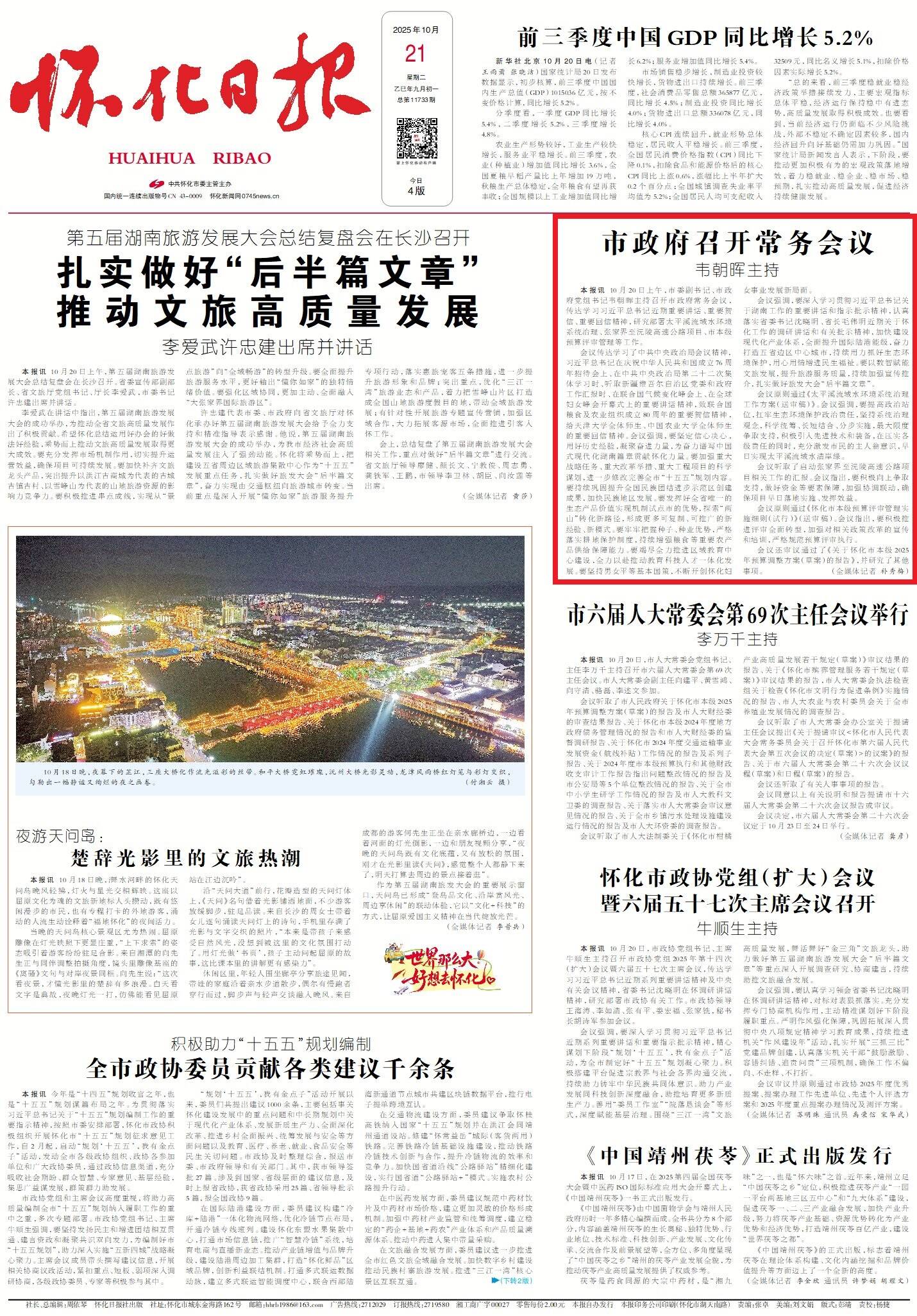 会议强调,要深入学习贯彻习近平总书记关于湖南工作的重要讲话和指示批示精神,认真落实省委书记沈晓明、省长毛伟明近期关于怀化工作的调研讲话和有关批示精神,加快建设现代化产业体系,全面提升国际陆港能级,奋力打造五省边区中心城市,持续用力抓好生态环境保护,用心用情增进民生福祉。要以数智赋能文旅发展,提升旅游服务质量,持续加强宣传推介,扎实做好旅发大会“后半篇文章”。