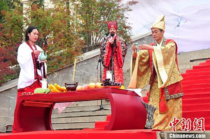 资料图:图为民众依秦礼,仿古制,行中华传统礼仪来表达重阳节的祝福。中新社记者 张添福 摄