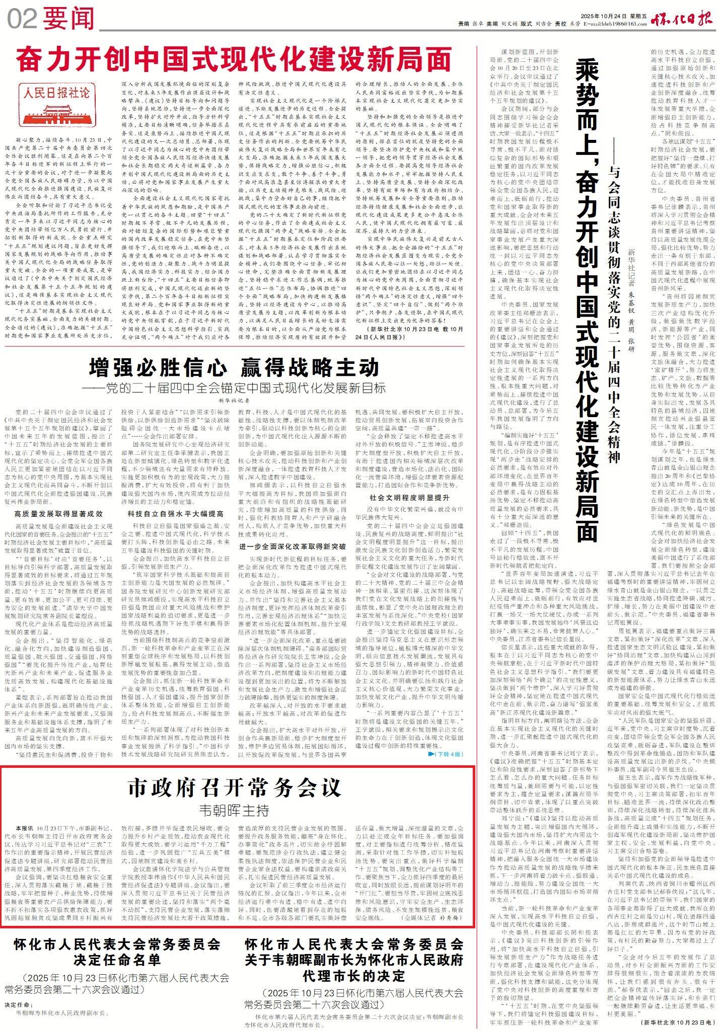 怀化日报全媒体讯 10月23日下午,市委副书记、代市长韦朝晖主持召开市政府常务会议,传达学习习近平总书记对“三农”工作作出的重要指示精神,开展民营经济促进法专题讲座,研究部署推动民营经济高质量发展、第四季度经济工作。