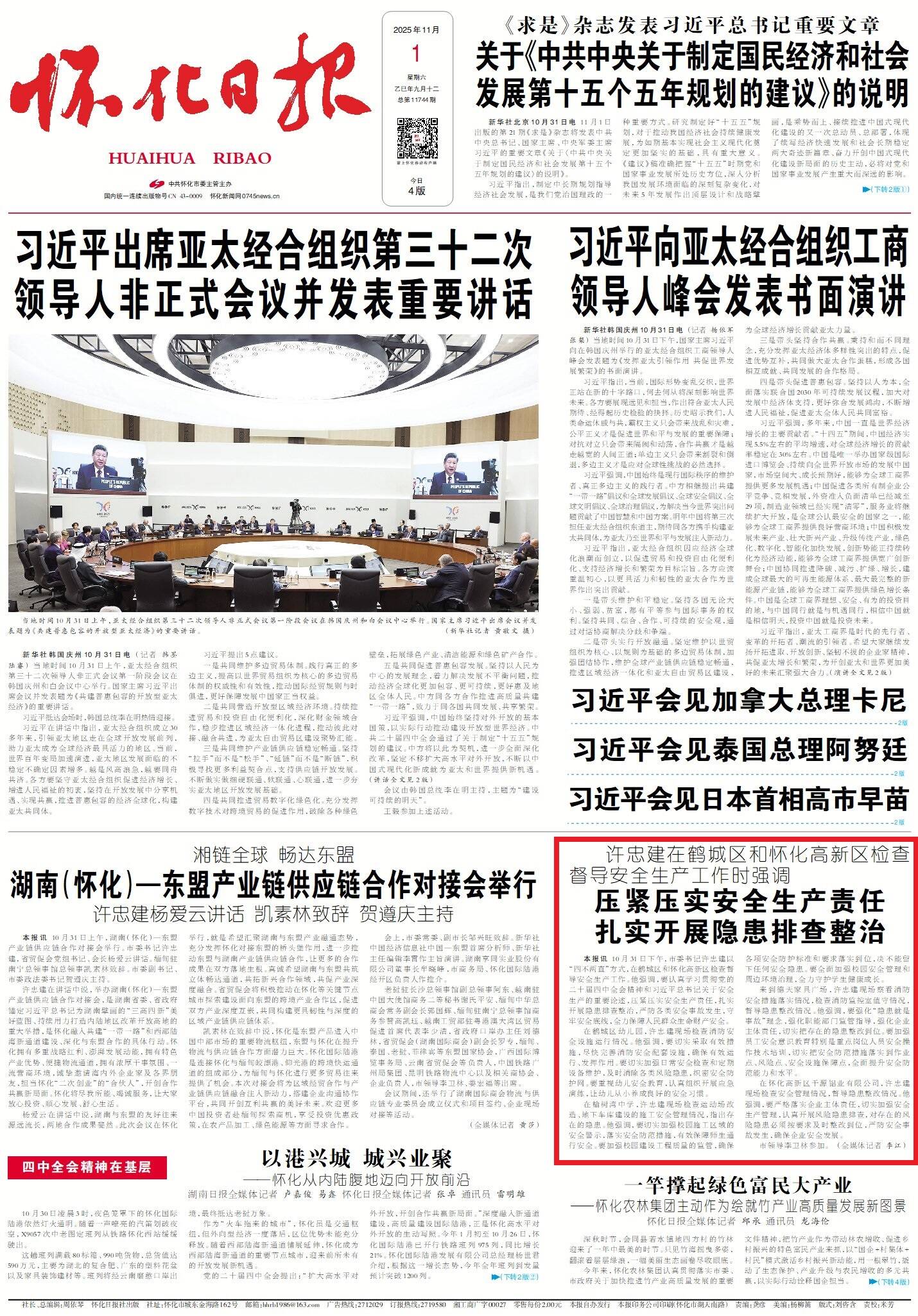 怀化日报全媒体讯 10月31日下午,市委书记许忠建以“四不两直”方式,在鹤城区和怀化高新区检查督导安全生产工作。他强调,要认真学习贯彻党的二十届四中全会精神和习近平总书记关于安全生产的重要论述,压紧压实安全生产责任,扎实开展隐患排查整治,严防各类安全事故发生,守牢安全底线,全力保障人民群众生命财产安全。