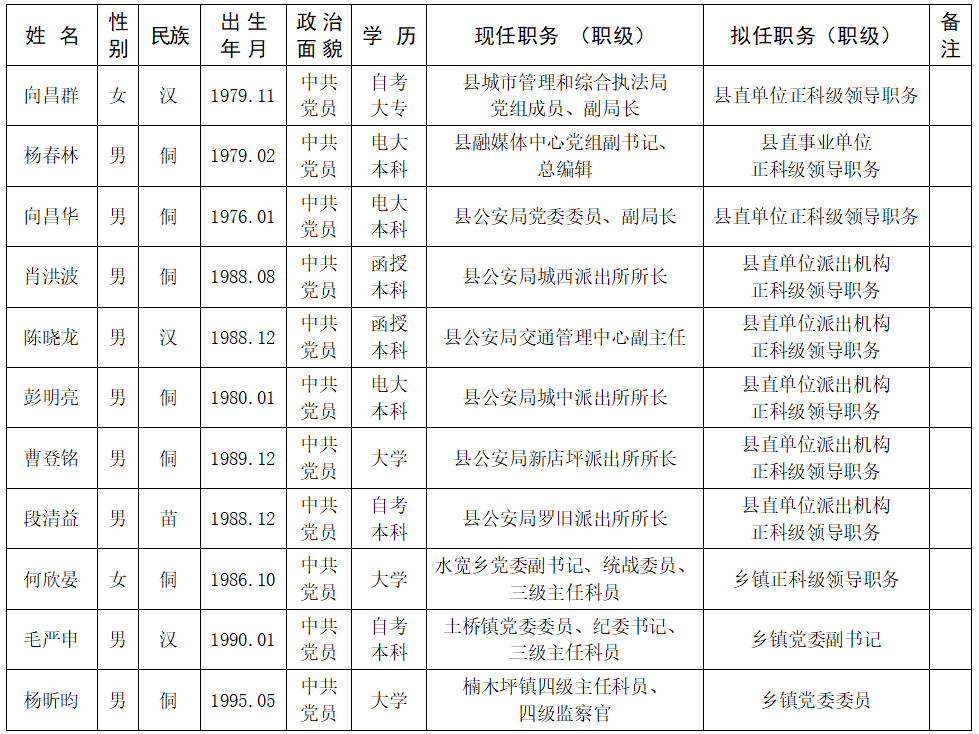 为了加强对干部选拔工作的监督,提高识别和任用干部的准确程度,现对芷江侗族自治县委常委会会议研究决定的下列拟任职人选(提名人选)进行任前公示。