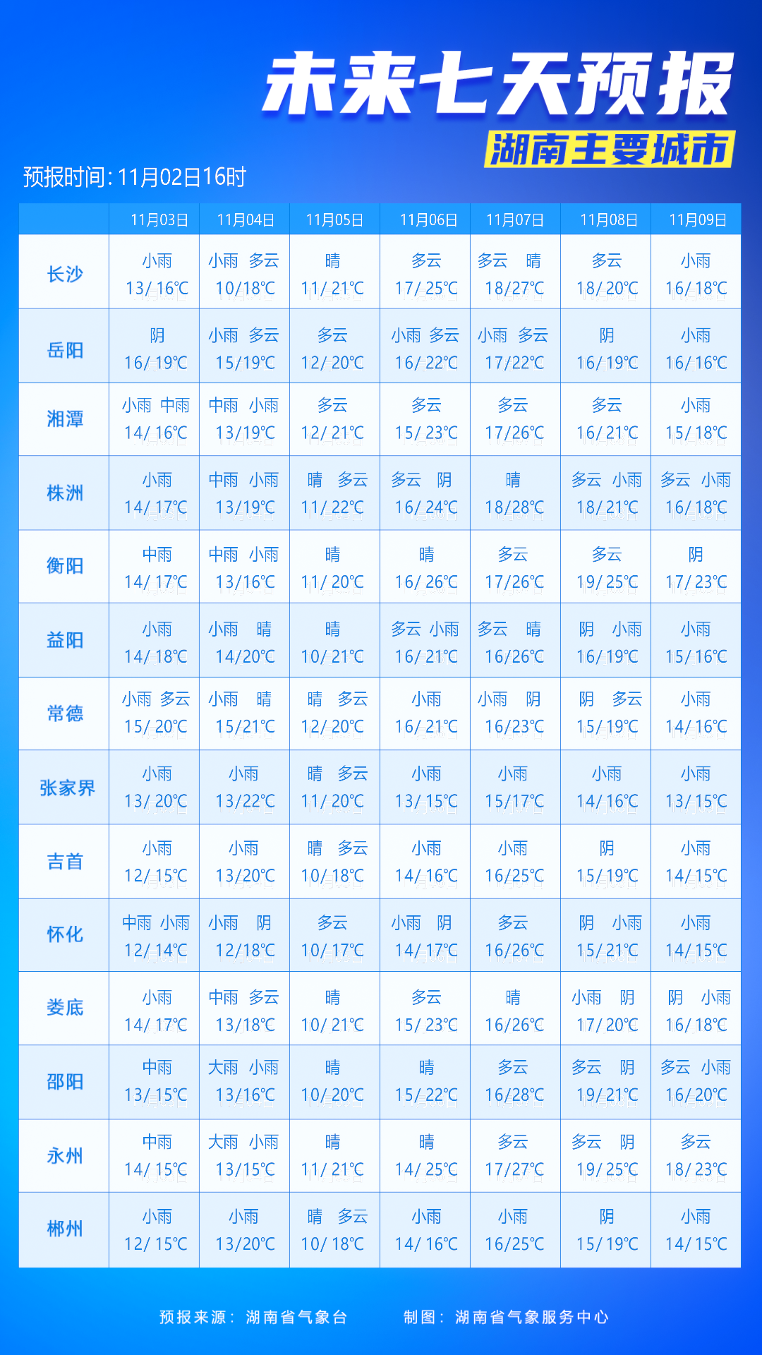 11月3日晚上至4日白天,湘中以南阴天有中雨,部分地区大雨,其他地区小雨转多云;南风2~3级;最低气温11~14℃,最高气温湘北22~24℃,其他地区14~19℃。