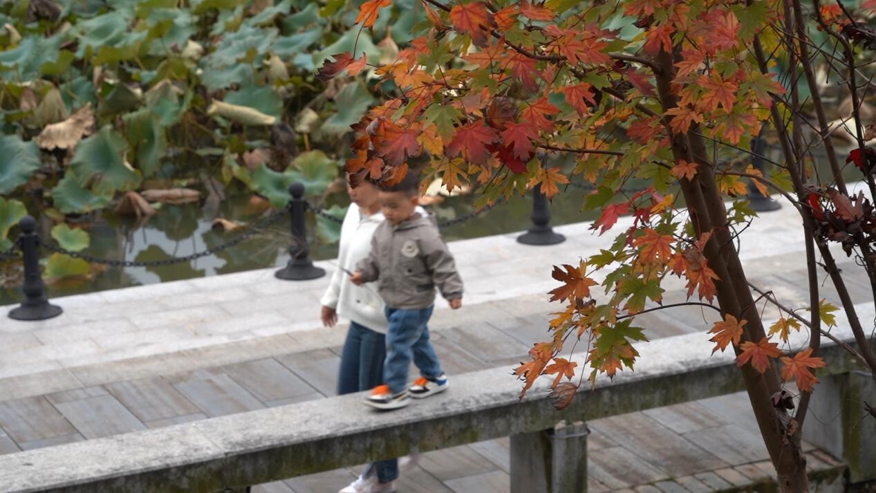 漫步园中,红枫如火。它们或挂在枝头,随风摇曳,似在向游客招手;或飘落在地,铺成一条红色的地毯,踩上去沙沙作响,仿佛在诉说着古老的往事。市民们穿梭其中,或拍照留念,或静坐观赏,享受着这份宁静与美好。