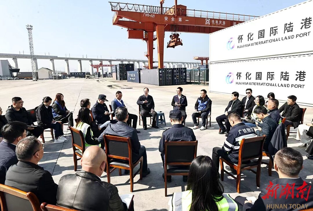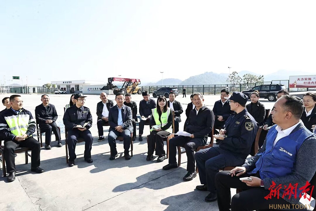 在怀化国际陆港主港区货场,毛伟明与企业员工围坐在一起,就学习贯彻党的二十届四中全会精神展开交流。毛伟明指出,要聚焦全会提出的新的历史方位、指导思想、重大原则、目标导向、战略举措和动力支撑,认清责任、担负使命,回答好“十五五”规划建议提出的“为什么、是什么、怎么干”等重大命题,努力在中国式现代化征程中发挥更大作用。具体要做到“四个把握好”:把握好中国式现代化这条主线。在持续用力打造“三个高地”上有大突破,在推进“4+4科创工程”上有大突破,在形成“五类人才”优势上有大突破,在贯彻“五大发展”理念上有大突破,为奋力谱写中国式现代化湖南篇章作出新的更大贡献。把握好发展新质生产力这个关键支撑。推动科技创新与产业创新深度融合,全力孵化新产业、培育新业态、拓展新场景、开发新模式,深化产业链、创新链、人才链、供应链协同发力,持续培塑发展新优势。把握好高水平开放这个重要动能。继续做好流量、流向、流效文章,立足箱包皮具、绿色食品、电子元器件、生物医药等特色产业集群,建立完善更高效的通关模式和更便捷的物流体系,做大做强东盟主线,全面融入西部陆海新通道。把握好推动共同富裕这个落脚点。坚持尽力而为与量力而行相协同,坚持投资于物与投资于人相结合,坚持港产城融合发展。