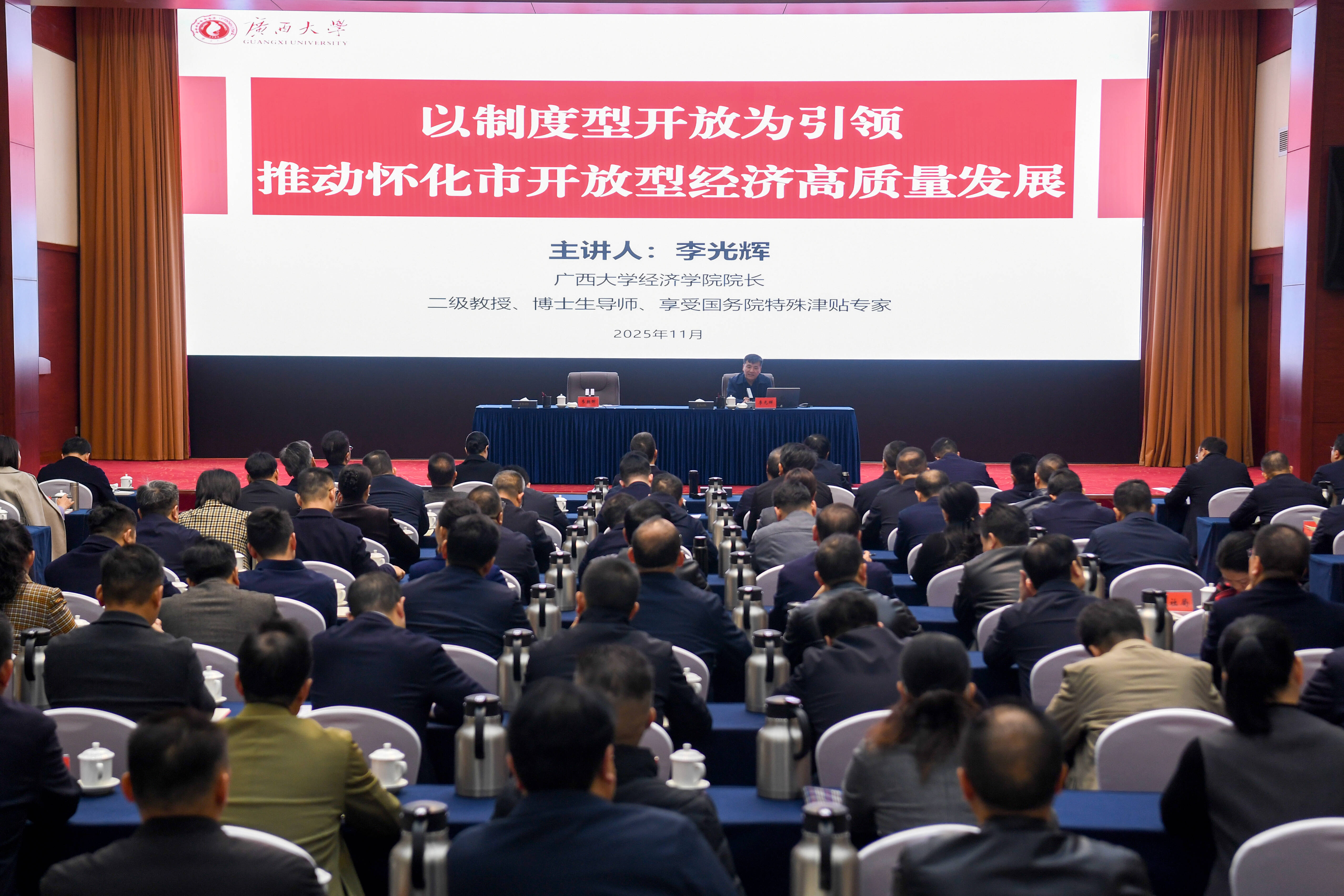 怀化日报全媒体讯 11月21日上午,2025年第6期“五溪大讲堂”举行,广西大学经济学院院长李光辉作专题讲座。市委书记许忠建,市委副书记、代市长韦朝晖,市人大常委会主任李万千,市政协主席牛顺生参加。