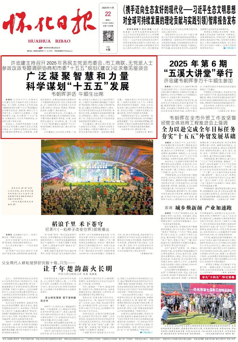 怀化日报全媒体讯 11月21日下午,市委书记许忠建主持召开2025年各民主党派市委会、市工商联、无党派人士参政议政专题调研协商和市委“十五五”规划《建议》征求意见座谈会。他强调,要深入学习贯彻中共二十届四中全会精神,广泛凝聚智慧和力量,科学谋划“十五五”发展。市委副书记、代市长韦朝晖讲话,市政协主席牛顺生出席。