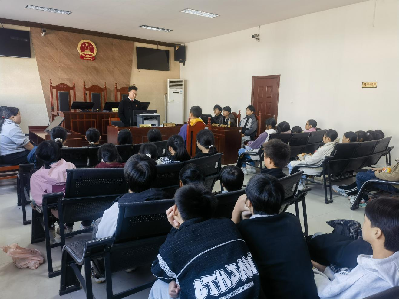 同学们先后参观了法庭调解室、警务室、代表委员联络室和审判庭等场所。在审判庭里,碧涌人民法庭负责人以“公民的基本义务和基本权利”为主题,结合相关的典型案例给同学们上了一堂深入浅出的法治课,引导同学们做一个尊法、学法、守法、用法的好公民。
