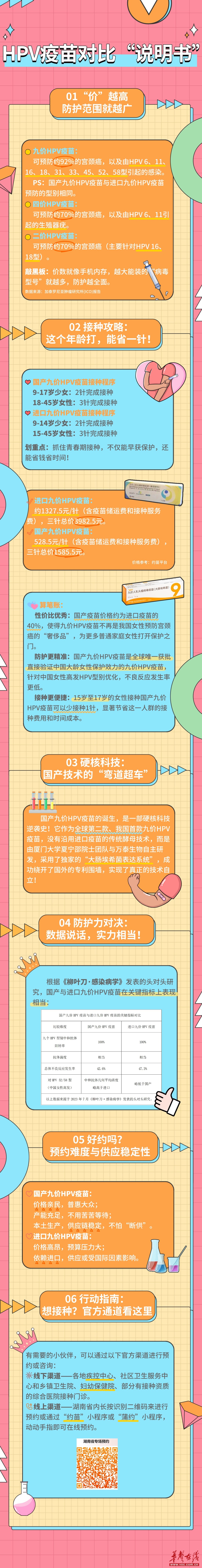 编者按:近日,国产九价HPV疫苗在湖南重磅上市。面对二价、四价、九价以及进口疫苗与国产疫苗的选择,许多网友仍在犹豫:该如何挑选?这张HPV疫苗对比“说明书”,帮你盘得明明白白!