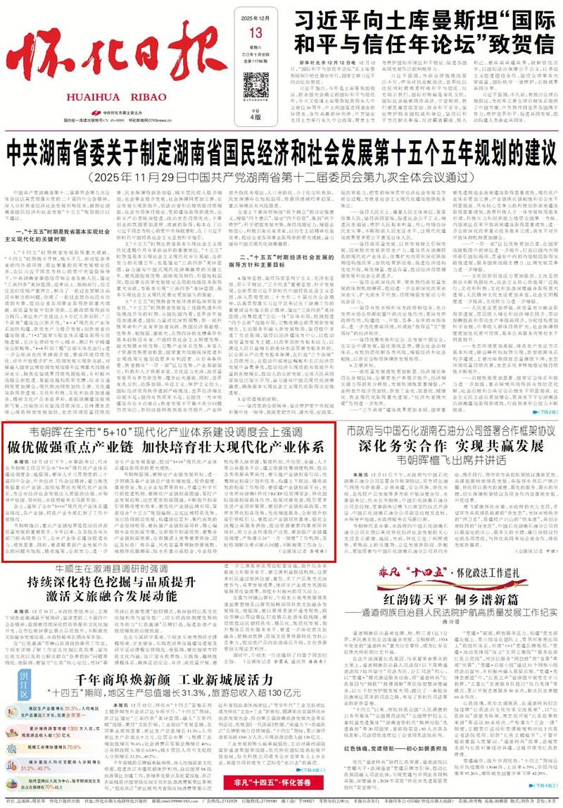 怀化日报全媒体讯12月12日下午,市委副书记、代市长韦朝晖主持召开全市“5+10”现代化产业体系建设调度会。她强调,要深入学习贯彻党的二十届四中全会、中央经济工作会议精神,着力做优做强重点产业链,加快培育壮大现代化产业体系,为全市经济社会发展注入更强劲动能。市领导尹培国、邹兴旺,市政府秘书长马源参加。