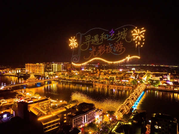 20时许,夜空骤然被点亮,1200架无人机如繁星般腾空而起。这些空中精灵在夜色的画布上挥洒创意,时而勾勒出芷江万和鼓楼的飞檐翘角,时而变幻出“芷因有你 江来更美”的遒劲字样。每一个精准的位移都诉说着科技的力量,每一组流畅的变形都演绎着艺术的魅力。