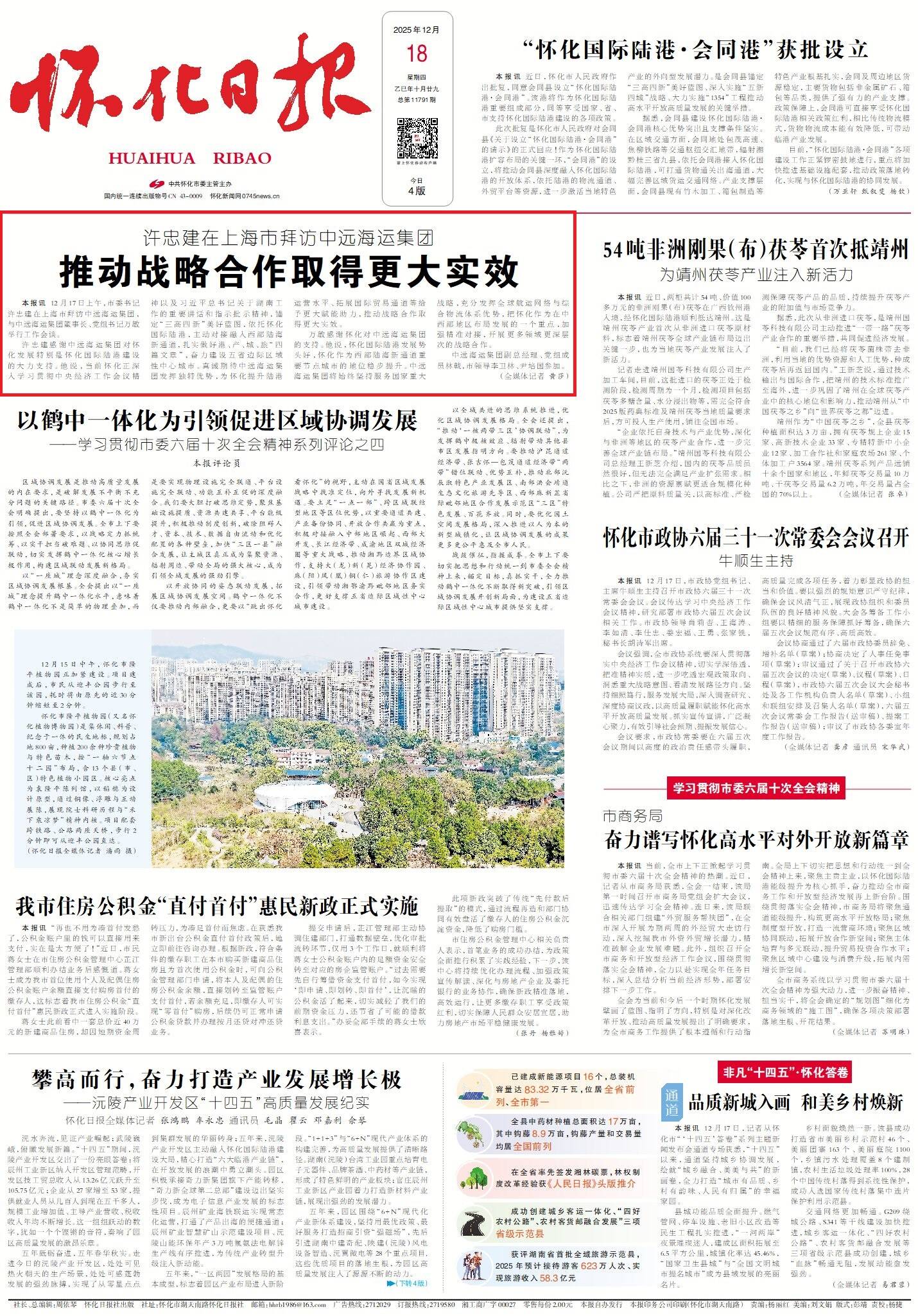 许忠建感谢中远海运集团对怀化发展特别是怀化国际陆港建设的大力支持。他说,当前怀化正深入学习贯彻中央经济工作会议精神以及习近平总书记关于湖南工作的重要讲话和指示批示精神,锚定“三高四新”美好蓝图,依托怀化国际陆港,主动对接融入西部陆海新通道,扎实做好港、产、城、旅“四篇文章”,奋力建设五省边际区域性中心城市。真诚期待中远海运集团发挥独特优势,为怀化提升陆港运营水平、拓展国际贸易通道等给予更大赋能助力,推动战略合作取得更大实效。