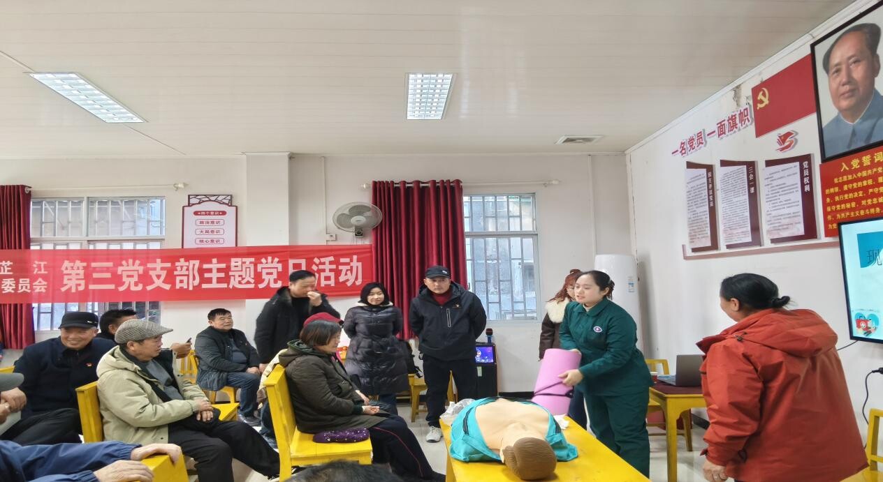 专家针对老年人常见健康问题,重点讲解了糖尿病、冠心病、高血压等慢性病的预防知识、早期识别方法及突发情况应急处理,帮助党员增强健康防护意识。 在实操教学环节,医护人员现场演示了心肺复苏的全过程,详细说明施救位置、按压要点、人工呼吸步骤及口腔异物清理等关键技巧。