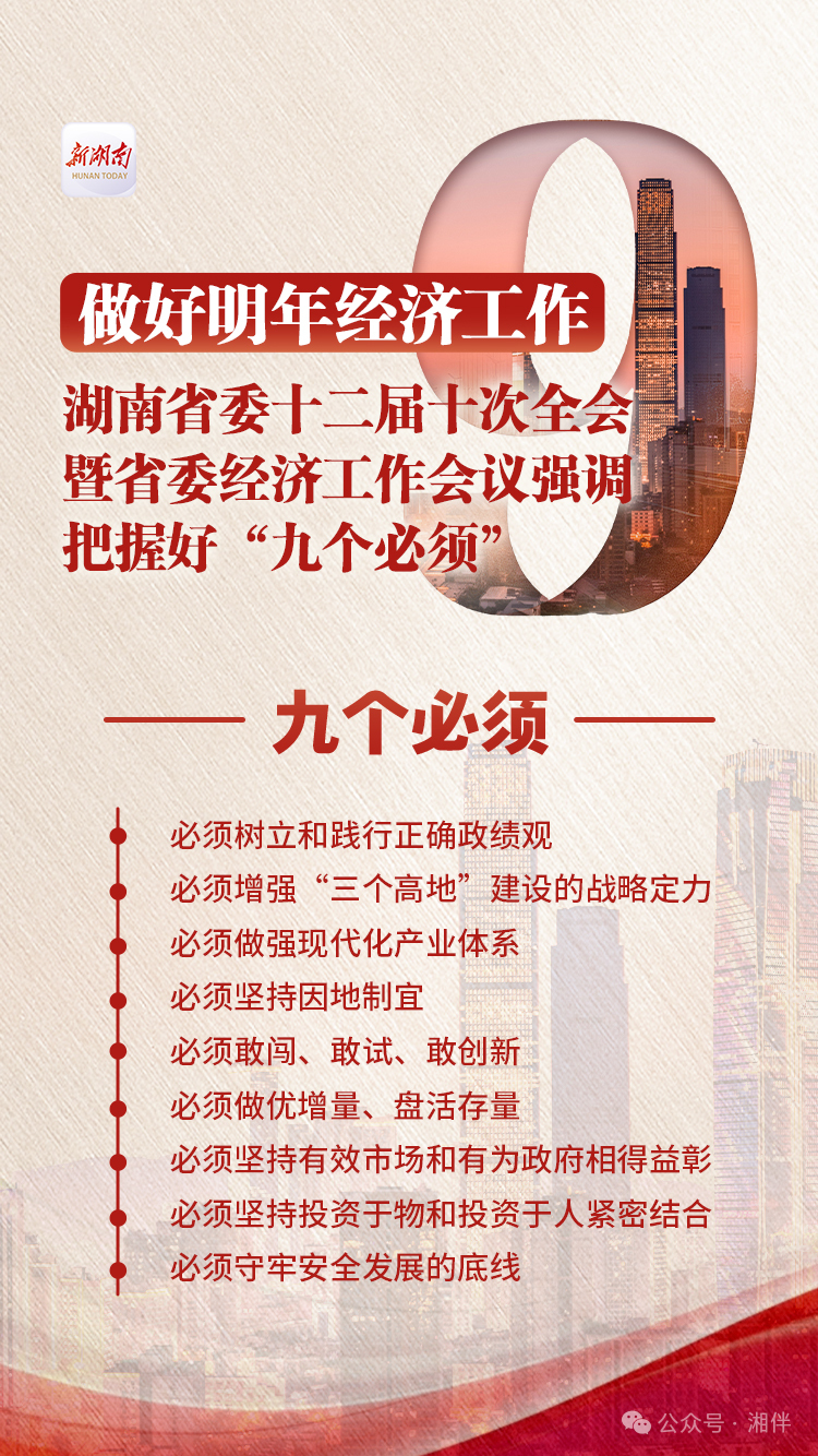 全会提出,做好2026年全省经济工作重点要把握好“九个必须”的要求。一是必须树立和践行正确政绩观,坚持高质量发展根本导向不动摇,自觉按规律办事,坚持问题导向、结果导向、目标导向相统一,完善差异化考核评价体系,真正做到为人民出政绩、以实干出政绩。二是必须增强“三个高地”建设的战略定力,持续滚动实施好标志性工程,确保“三个高地”建设取得更多实质性进展。三是必须做强现代化产业体系,处理好发展新质生产力和推动传统产业转型升级、招引新企业和支持存量企业扩能升级、制造和生产性服务的关系,巩固壮大实体经济根基。四是必须坚持因地制宜,统筹好全局和一域、抢位发展和错位发展、优先发展和协同发展,进一步提升整体发展效益。五是必须敢闯、敢试、敢创新,发扬“敢为天下先”的精神,破除束缚“干部敢为”的条条框框,发挥“地方敢闯”的能动性,稳住“企业敢干”的预期,激发“群众敢首创”的活力。六是必须做优增量、盘活存量,摒弃“重增量、轻存量”的惯性思维,统筹用好增量资源和存量资源,继续推进零基预算改革,用好用活存量资金,善于通过盘活存量来带动增量。七是必须坚持有效市场和有为政府相得益彰,更好发挥市场机制作用,深度融入全国统一大市场建设,有效规范市场秩序,加快社会信用体系建设,形成既“放得活”又“管得好”的经济秩序。八是必须坚持投资于物和投资于人紧密结合,转变投资观念,优化投资结构,扩大有效益的投资,以有效投资带动消费,提高投资于人的精准性可及性。九是必须守牢安全发展的底线,积极防范化解地方债务、房地产、金融、生态环境等领域风险隐患,强化社会治安整体防控,确保社会大局平安稳定。