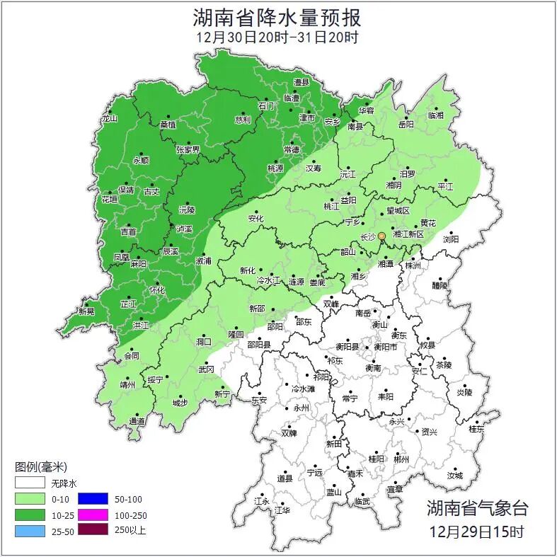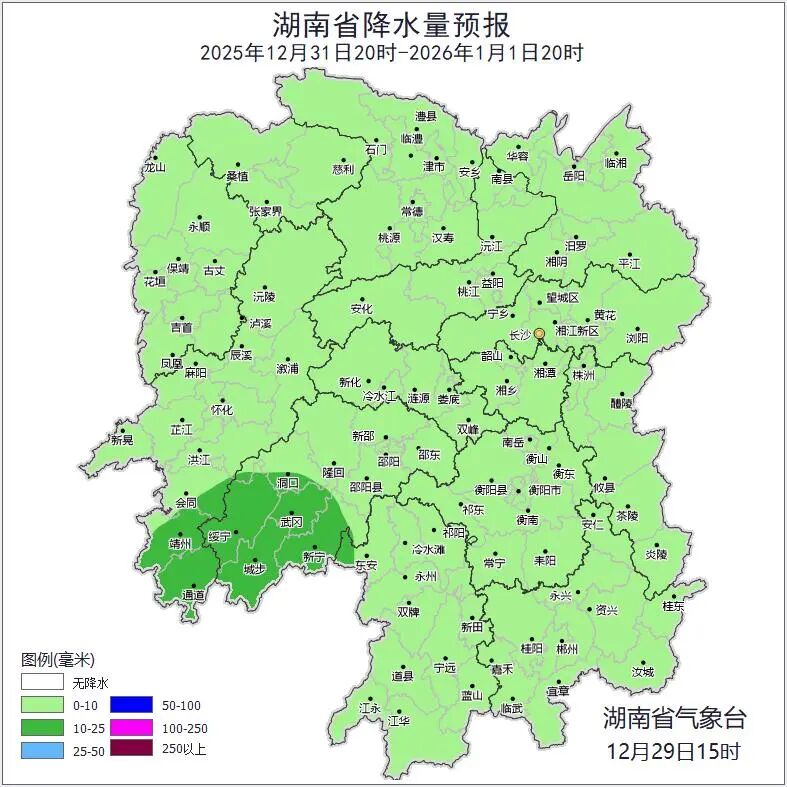 重点防范31日至1月1日降雨、大风及31日晚湘西北高海拔地区雨雪天气对假期交通出行、城市安全运行、户外活动及农业生产等的影响,高海拔地区注意道路结冰风险。
