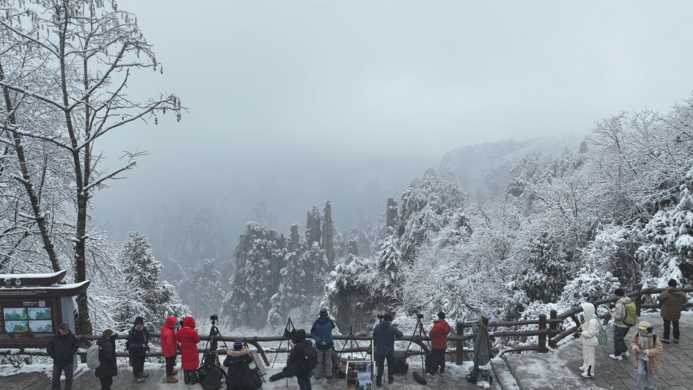 1月2日,游客在湖南张家界武陵源风景名胜区欣赏雪景。新华社发(张洪涛 摄)假期里,张家界武陵源风景名胜区迎来降雪,云海、雾凇、峰林相映成趣。这份“冬日限定”的景色,吸引众多游客专程到张家界观雪,各大景区内快门声与欢呼声不绝于耳。