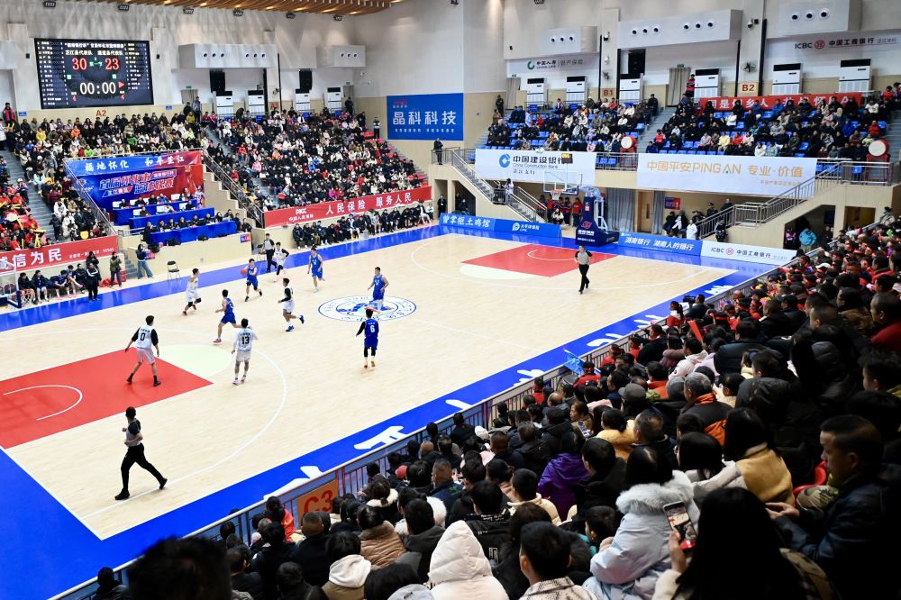 图为1月2日晚拍摄的首届怀化市篮球联赛芷江队与通道队比赛现场。新华社发(张卓 摄)元旦期间,首届怀化市篮球联赛迎来数场比赛,各地以球为媒,串联起非遗、美食、景区、特色住宿的全链条文旅体验。