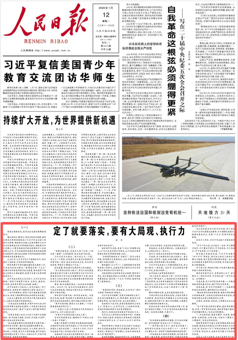 1月12日出版的《人民日报》发表任平文章《定了就要落实,要有大局观、执行力》。全文如下,一起来看。