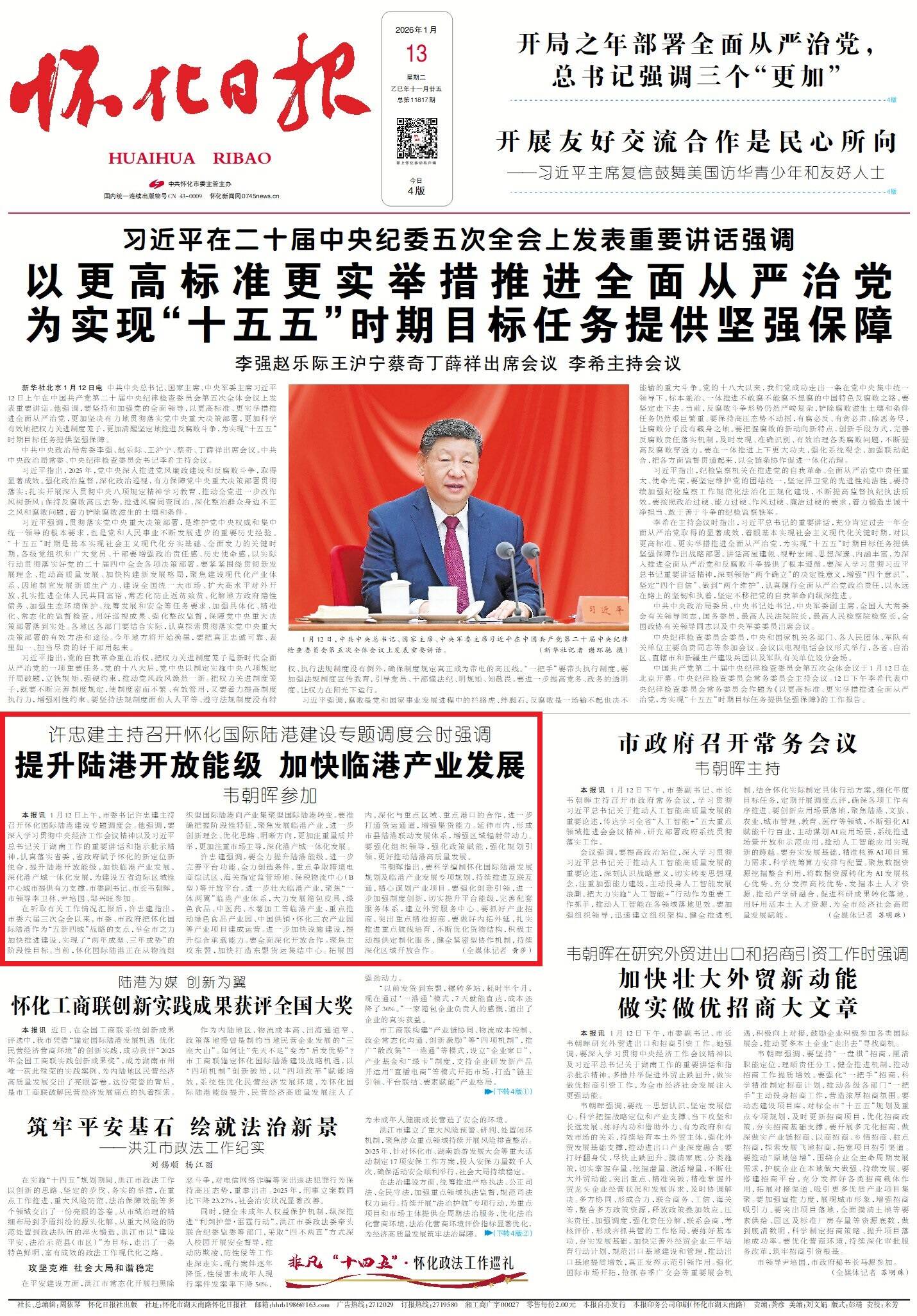 怀化日报全媒体讯 1月12日上午,市委书记许忠建主持召开怀化国际陆港建设专题调度会。他强调,要深入学习贯彻中央经济工作会议精神以及习近平总书记关于湖南工作的重要讲话和指示批示精神,认真落实省委、省政府赋予怀化的新定位新使命,提升陆港开放能级,加快临港产业发展,深化港产城一体化发展,为建设五省边际区域性中心城市提供有力支撑。市委副书记、市长韦朝晖,市领导李卫林、尹培国、邹兴旺参加。