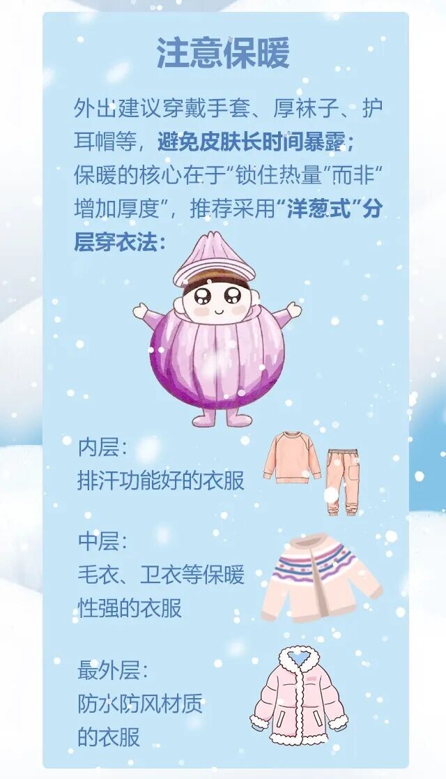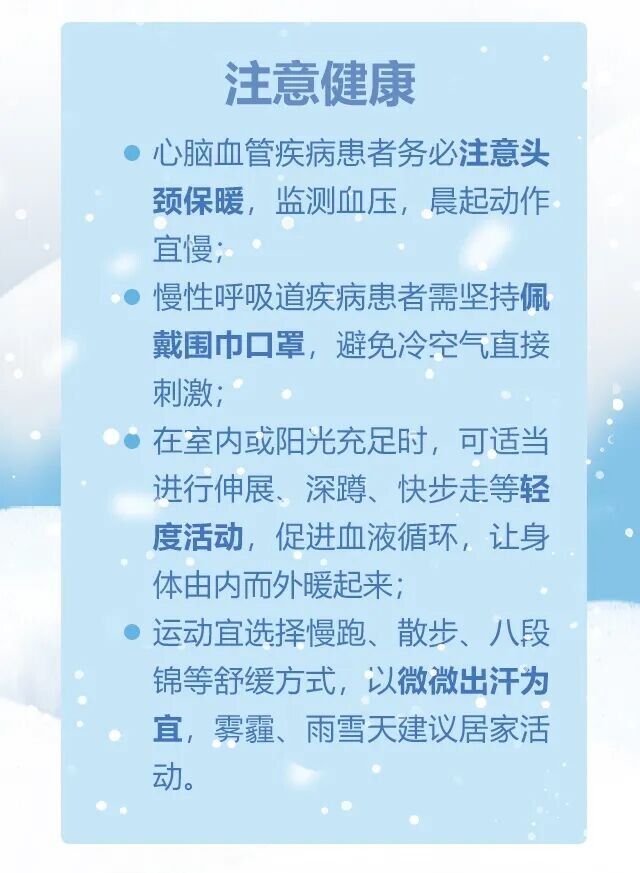 2.低温持续时间长,需加强能源保供和城市安全运行管理;公众需注意取暖用火用电用气安全,加强健康防护,防范呼吸道及心脑血管疾病;油菜及经济林果做好防冻措施;