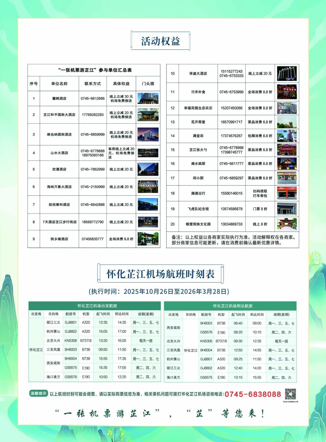 机场提醒,相关权益以各商家实际执行为准,建议消费前确认最新优惠。一张机票,多重惊喜,欢迎旅客冬春季来芷江体验山水人文之旅。
