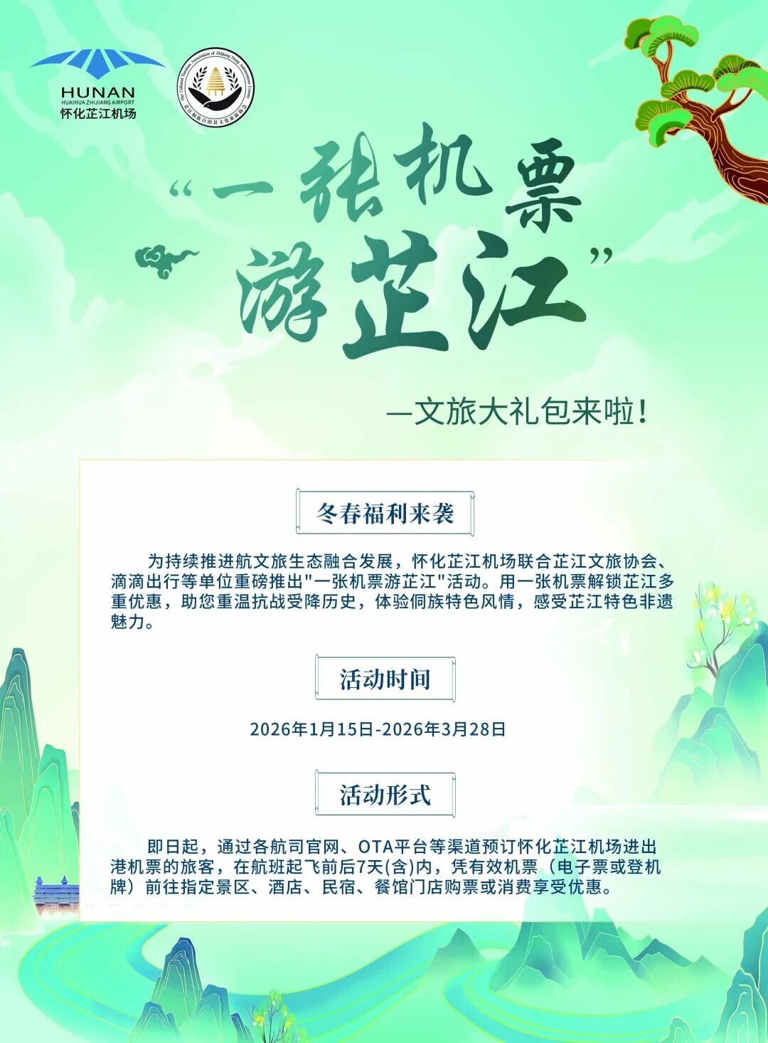 芷江融媒讯(通讯员 郑玲 唐渊)为促进航文旅融合发展,怀化芷江机场联合芷江文旅协会、滴滴出行等单位,于2026年1月15日至3月28日推出“一张机票游芷江”活动。旅客凭进出港机票即可享受芷江景区、酒店、餐饮等多重优惠。