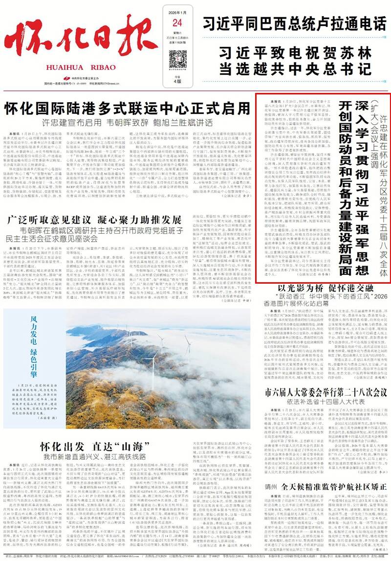 怀化日报全媒体讯  1月23日,怀化军分区党委十五届八次全体(扩大)会议召开。市委书记、怀化军分区党委第一书记许忠建出席并讲话。他强调,要深入学习贯彻习近平强军思想,强化使命担当,狠抓任务落实,奋力开创国防动员和后备力量建设新局面。