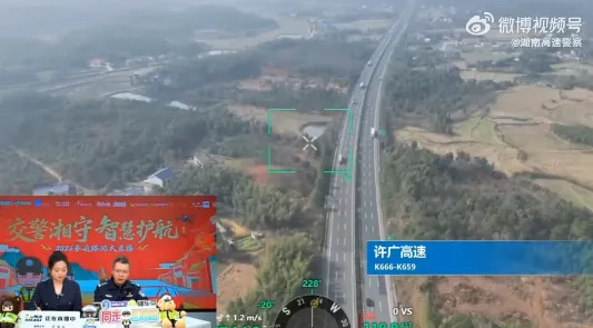 高速交管六、三、四、二支队配合,开展无人机接力巡航,在直播中由南往北展现许广高速湖南全境路况。