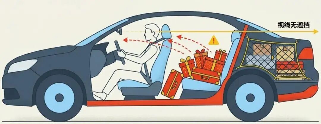 此外,不少车辆的后座也会成为装载年货的“主力军”,此时注意不要挡住后视镜视野。