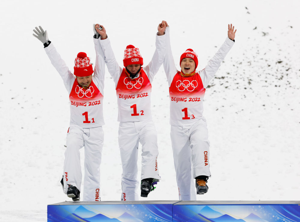 中国队选手徐梦桃、贾宗洋和齐广璞(从左至右)在北京2022年冬奥会自由式滑雪空中技巧混合团体决赛颁发纪念品仪式上。新华社记者 费茂华 摄