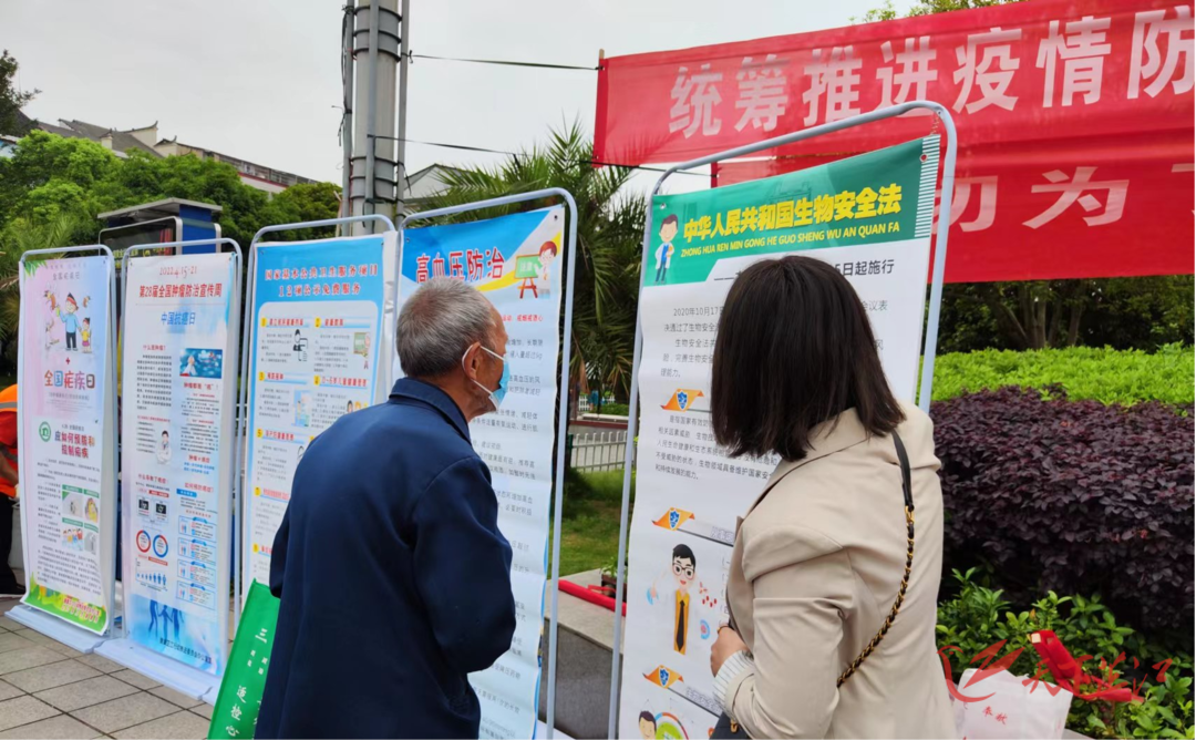 活动现场,《生物安全法》知识、疫情防控注意事项、禁毒知识、防范非法集资、老年健康生活常识、高血压、糖尿病、肿瘤等常见病的防治、职业病防治、疫苗接种注意事项等宣传展板有序摆放,吸引不少市民驻足观看。咨询台前的工作人员耐心细致的解答群众提出的问题。其他工作人员向过往市民发放宣传手册开展面对面讲解宣传。