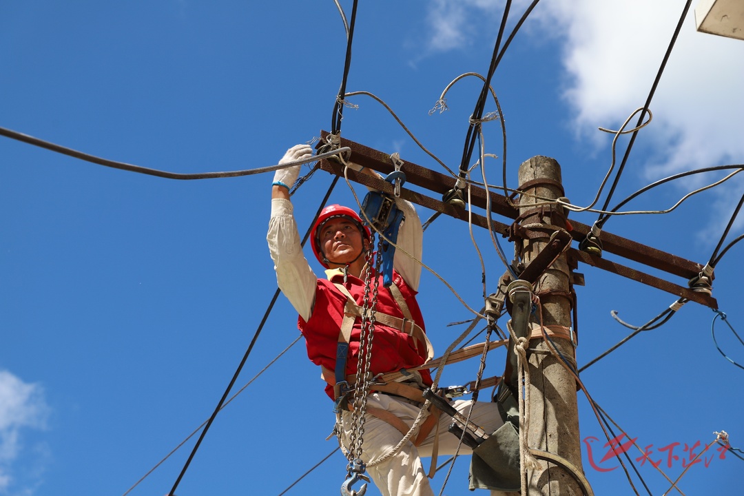 湖南岳阳临湘供电公司忠防供电所员工在10千伏笔沙线沙坪方家台区,为农户免费安装濳水泵进行抗旱抽水。方四义摄