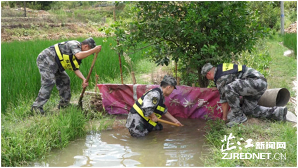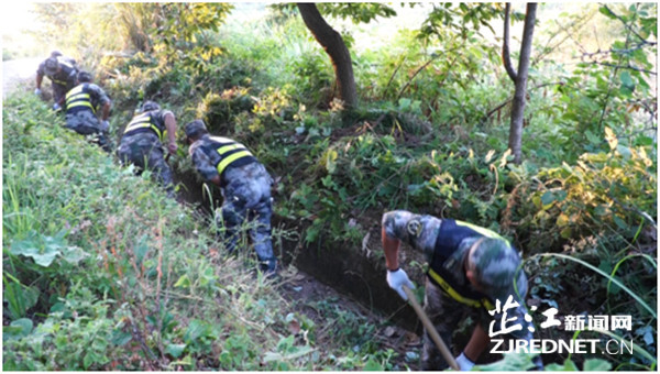 在芷江镇蚂蟥塘村,民兵、当地镇村两级干部自发成立“抗旱保收”服务队,前往村组重点地段进行除杂草、清淤、修渠、挖塘引水等工作。清淤现场,军民分工合作,合力将渠道内的杂草、淤泥和石块清理上岸,经过近7小时的努力,长度近达4000米的沟渠被清理得干干净净,有效保障了农耕灌溉用水,也极大改善了水渠周边环境。