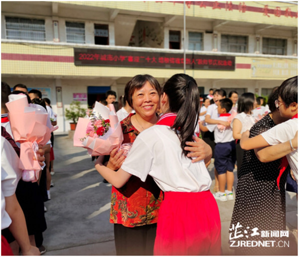 上午9点,全体师生齐聚操场,庆祝活动在升国旗唱国歌中开始。13位退休老师、96名职教师、4名校园保安在全场学生的热烈掌声中,有序入场接受学生的鲜花和拥抱,感受着节日的祝福。退休教师刘桂珍发言,她深情地说:“城南是个温暖的大家庭,虽然已经离开了,但城南的荣与辱依然牵动着我们的心。”活动中,还表彰了37名教师并颁发荣誉证书和佩戴绶带。
