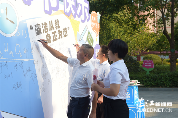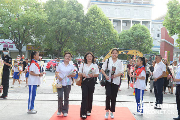 “老师,节日快乐,老师,您辛苦啦!”9月9日清晨,少先队礼仪队员在校门口笔直列队,向每一位走进学校的老师敬队礼、问好并送上鲜花。老师们走红毯、在师德师风承诺墙签名并合影留念。