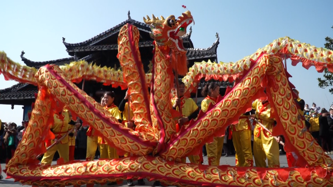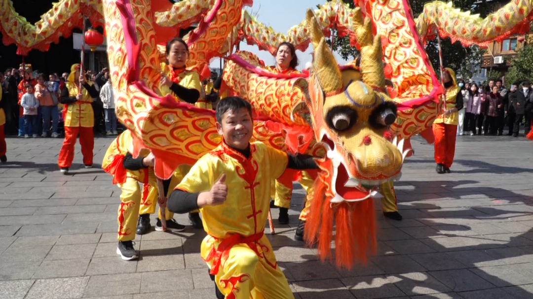 随着锣鼓乐伴奏,两条巨龙“飞驰而入”,瞬时现场喝彩声此起彼伏,雷鸣般的掌声也随之响起,十几名舞龙队员紧握舞龙棍,左翻右扬,灵活巧妙紧追“龙珠”。