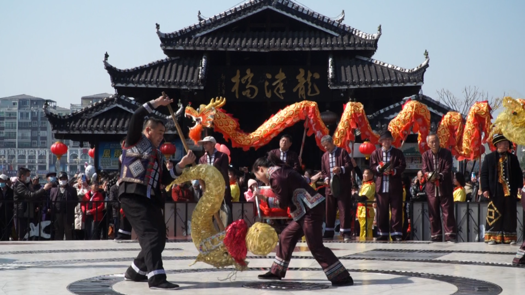 当现场观众还沉浸舞龙环节时,国家级非遗项目——芷江孽龙也随之前来凑热,直接将整个预热活动推向了高潮。舞台上,只见一只只蛟龙胡须乱飞。随着舞“宝”之人时而“藏宝”、时而戏龙,时而前引、时而后躲,更惹得蛟龙百态顿显。只见活动现场掌声、欢笑声、呐喊声源源不断。据了解,芷江孽龙舞已逐渐演变为集扎龙、祭龙、舞龙、游龙、化龙等一系列独特的孽龙民俗活动。孽龙舞传承人田海清介绍,元宵节这天,还会举行庄重的“化龙”仪式,祈求“孽龙”护佑村寨风调雨顺、四季丰收,寨民平安祥瑞、阖家康宁。